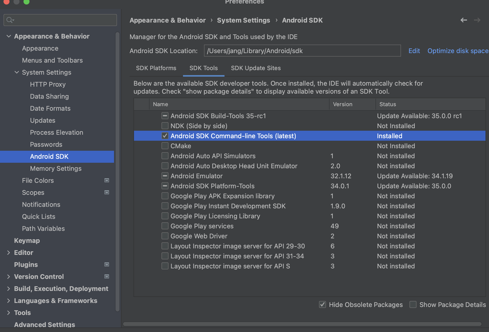 Setting - Apperance & Behavior - System Settings - Android Sdk - Sdk Tools 에서 3번째 줄 설치