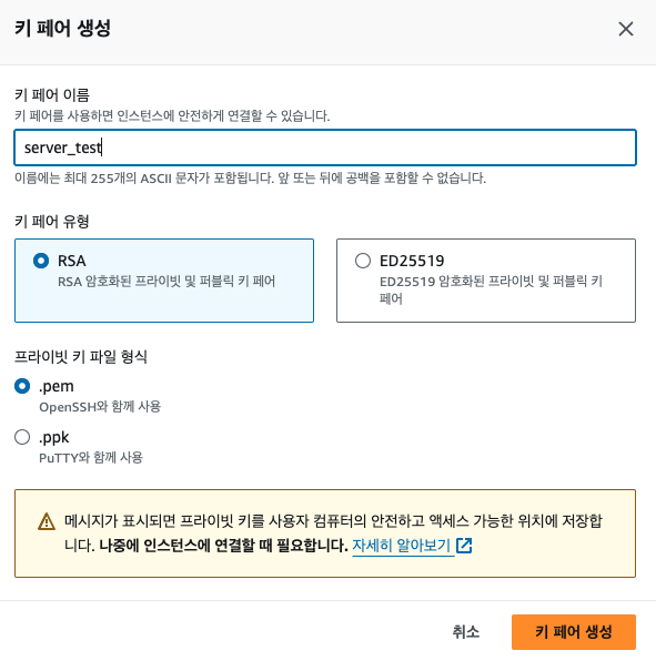 - 키페어 추가 및 저장 (새 키 페어 생성 클릭)