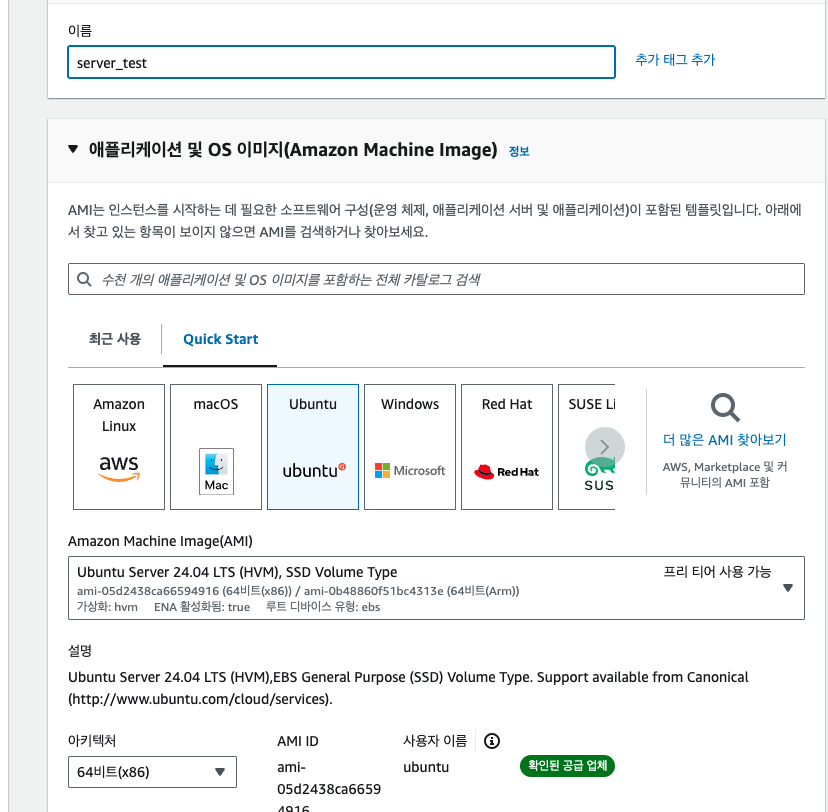 - 운영 체제는 Ubuntu 20.04 LTS 또는 최신 버전을 선택합니다.