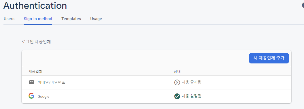 그 뒤에 Sign in method 를 클릭하셔서 제공업체를 추가해주셔야 됩니다 .