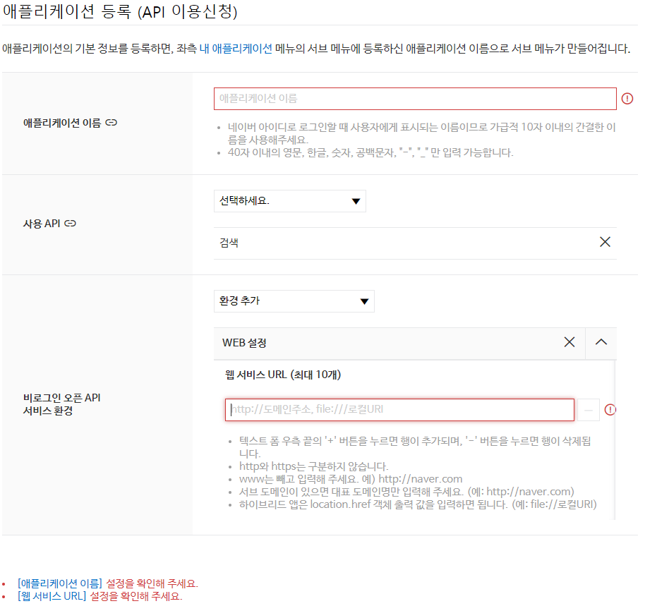 네이버 API 등록 화면