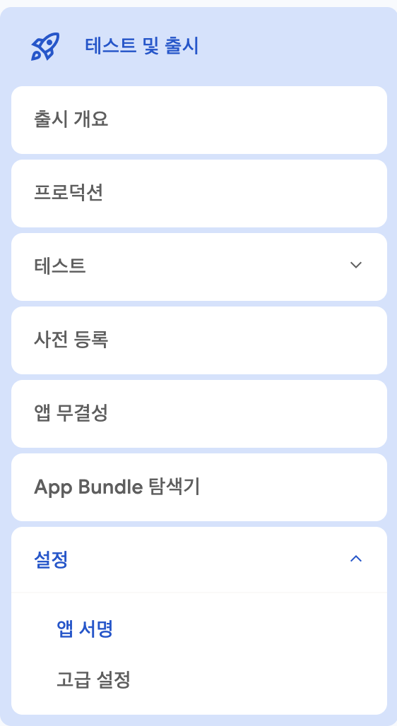 구글 스토어 / 테스트 및 출시 / 설정 / 앱 서명 / SHA-1 인증서 지문 복사