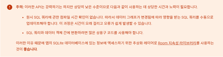 아무튼 이러한 이유들로 구글에서는 SQLite 대신 Room을 사용할 것을 권장하고 있다.