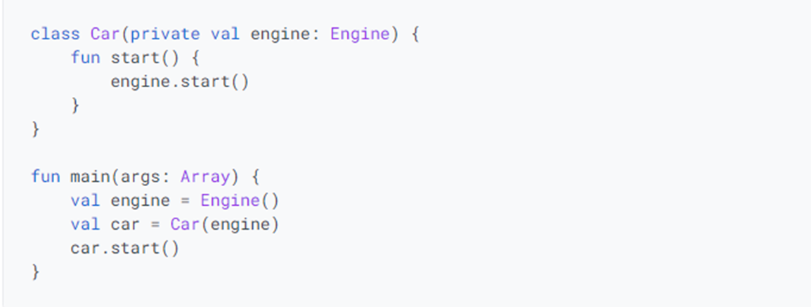 이유는 저 위의 코드를 보면 알겠지만 의존성의 주입이라 함은 Engine 클래스를 Car 클래스 내부에서 생성하고 사용하는 것이 아니라 Engine를 클래스 외부에서 생성한 다음에 Car 클래스로 가져와 사용하는 것이기 때문입니다 .