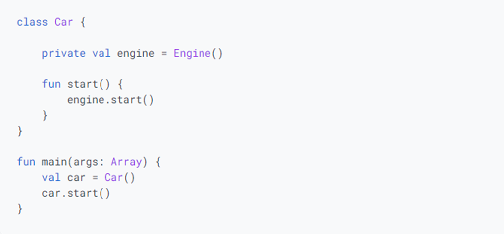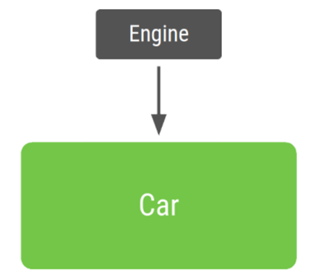 Car 라는 클래스가 동작을 하기 위해서는 Engine 이라는 클래스가 필요하다. 만약 Engine 클래스 가 없으면 이 Car 클래스는 동작을 할 수가 없게 된다. 이와 같은 경우 Car 클래스는 Engine 클래스와 의존성 관계가 있다 라고 말을 할 수가 있겠습니다.