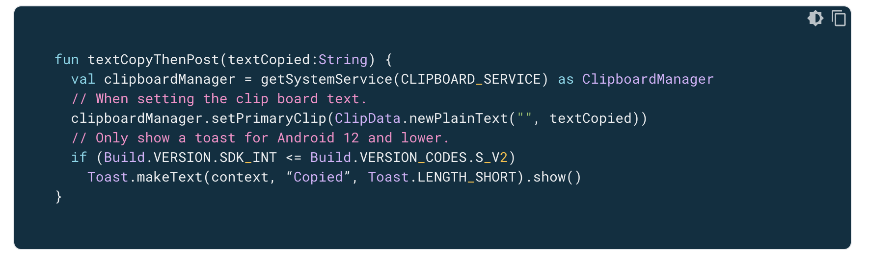 현재 안드로이드 버전 13 이상부터는 자동으로 클립보드 메세지가 뜨게 되어있습니다. 그래서 중복 클립보드 메세지가 나오지 않게 하려면 이렇게 코드를 다시 수정해야합니다 ! 이상입니다 !