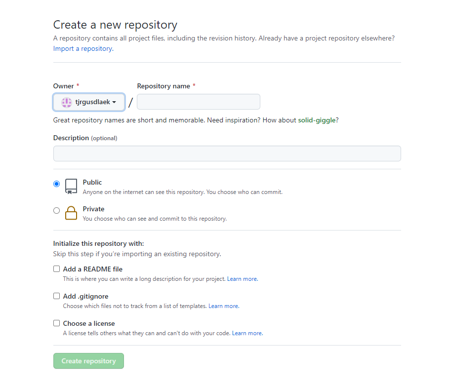Repository name 을 정하고 생성한다.