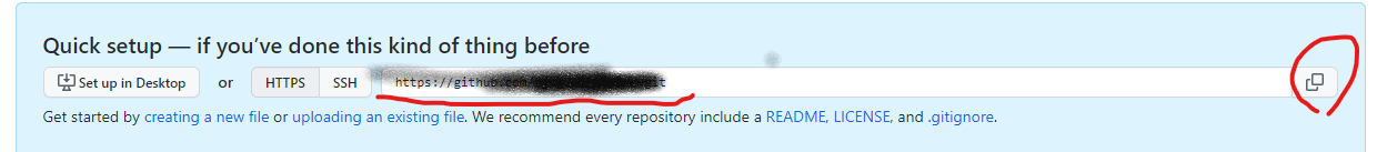3. 생성된 저장소의 주소를 기억해두자. ( 오른쪽 동그라미 누르면 주소 복사됨)